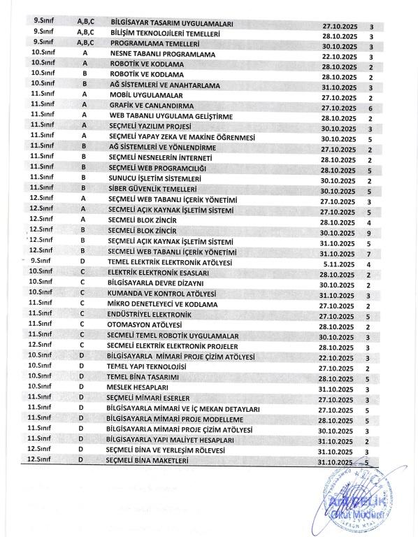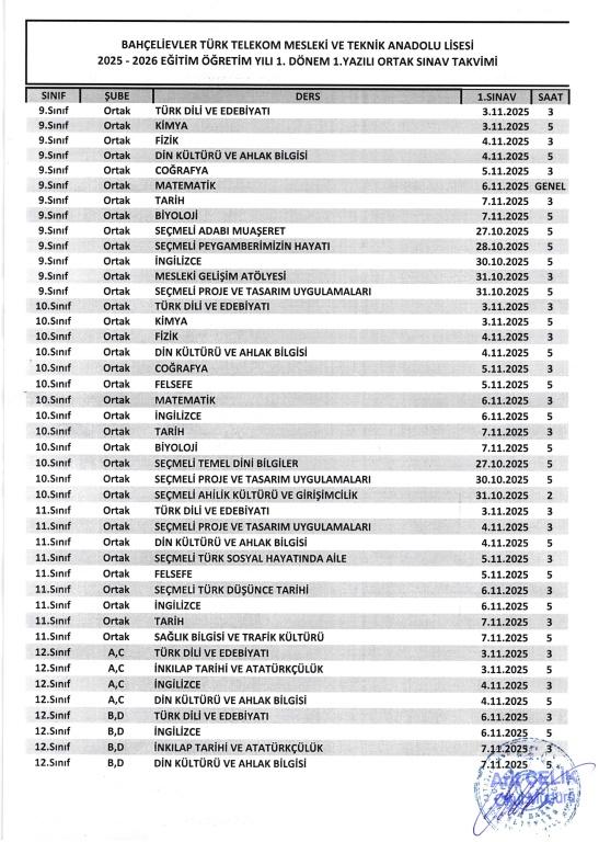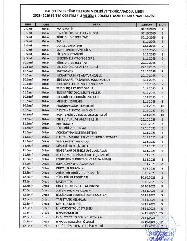 2025 2026 1 dönem 1. yazılı ortak sınav TAKVİMİ örgün ve mesem